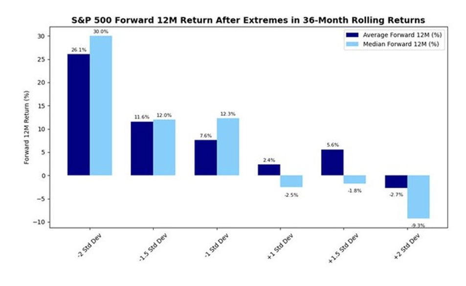 When the market deviates 2 standard deviations above the norm, history suggests the subsequent 3-year annualized returns are… uninspiring. Usually flat to negative. The market is a mean-reverting beast. It hates outliers.